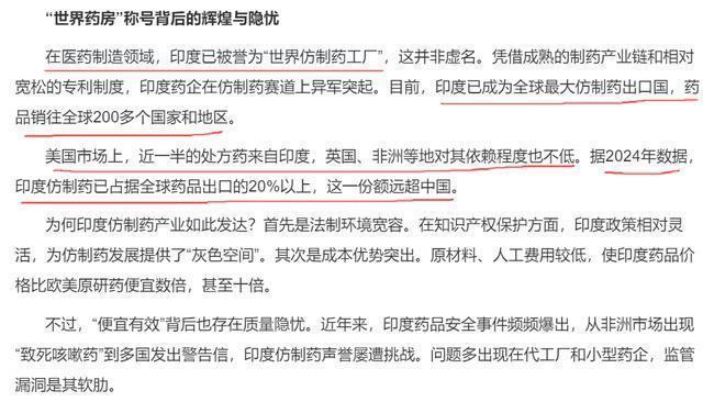 在这个故事中,主人公购买的正版药物价格差不多要30万元,而购买印度仿制的同款药物,一个月只要4000元左右。也就是从那时候开始,小编才知道在印度仿制药几乎是合法的。当然,如果不去仔细研究,也会给人一种耍流氓的感觉,毕竟药品是有知识产权的,属于别人的研究成果,乍一看去,的确值得嘲笑。 不过回到影视剧里,回到现实中,印度的仿制药的确挽救了很多生命。据相关报道,印度已经被誉为“世界仿制药工厂”,成为全球最大的仿制药出口国,药品销往全球200多个国家和地区,美国市场上近一半的处方药来自印度,英国、非洲等地对其依赖也不低,2024年印度仿制药占全球药品出口的20%以上。